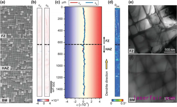 圖3 在EBM處理后的樣品中不均勻分布的γ′組織形態(tài)、彈性應(yīng)變和完全熱處理后的位錯