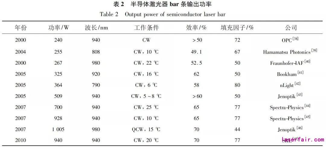 隨著技術發(fā)展和單管輸出功率的提高,半導體激光bar條的輸出功率也顯著增加。厘米 bar條的輸出功率從 2000 年時的 240 W 已經提高至1 000 W 左右,增大到原來的 4 倍,增長非常迅速,如表 2 所示。