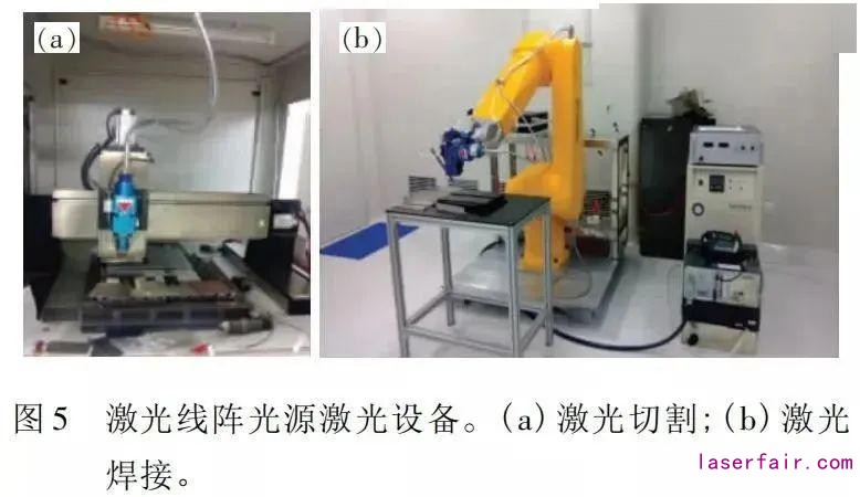 基于線陣合束光源,我 們 研 制 出 200 μm / 0.2NA光纖連續(xù) 400 W 功率輸出的激光器,可用于薄不銹鋼板的切割; 研制出 200 μm /0.2NA 光纖連續(xù) 3 000 W 功率輸出的激光器,用于金屬板焊接。設備照片如圖 5 所示。