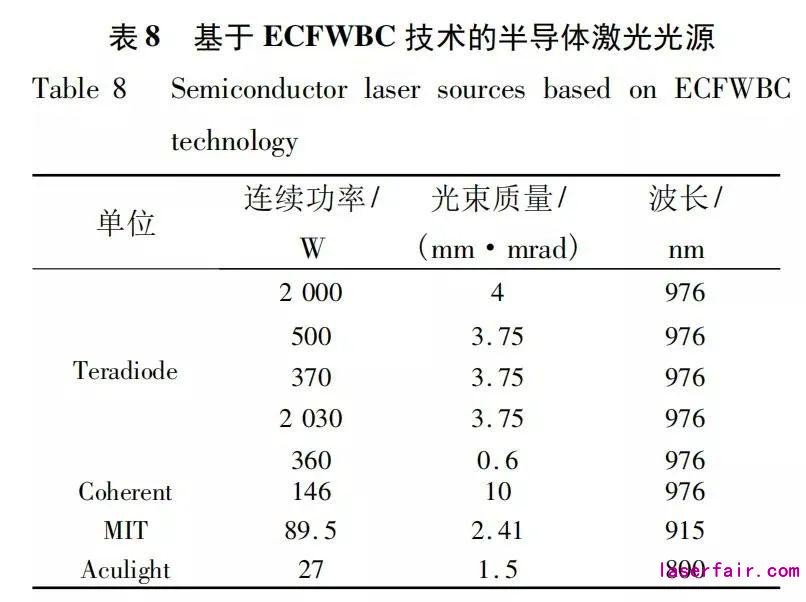 美國麻省理工( MIT) 、美國 Teradiode、美國Coherent、美國 Aculight、法國 Thales 和丹麥科技大學(DTU) 在 ECFWBC 技術的研究上取得了重要進展,如表 8 所示。美國 Teradiode 公司已達到商品化水平,2012 年,其 2 030 W 半導體激光合束光源產品已達到相同功率條件下商用全固態(tài)激光水平。