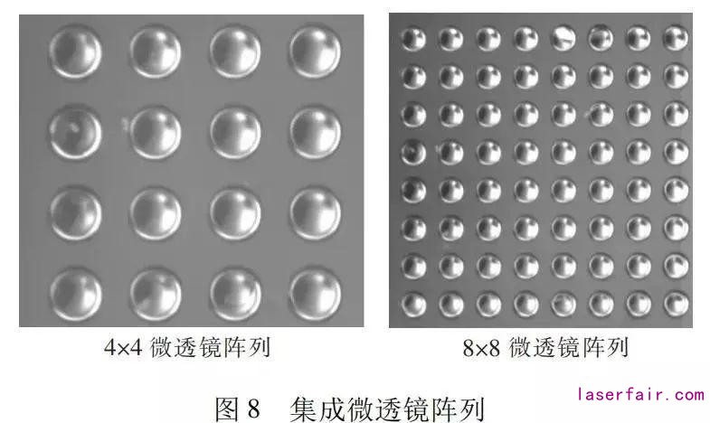 2010 年,我們在國際上首次提出并實現(xiàn)了大功率 VCSEL 集成面陣與其微透鏡面陣的單片集成,6 × 6 VCSEL 集成微透鏡陣列實現(xiàn)了 1.0 W基模激光輸出,發(fā)散角由 14. 8°降到 6. 6°,光束質量獲得成倍改善,為發(fā)展高光束質量大規(guī)模集成列陣激光開辟了新方向。圖 8 為集成微透鏡陣列照片。