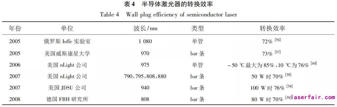 隨著技術的發(fā)展和各國科研項目的支持( 美國國防先進技術研究計劃署( DARPA) 專門設立了提高半導體激光器的電光轉換效率到 80% 為目標的超高效率激光器光源( SHEDS) 項目) ,高功率半導體激光器光源的效率已經達到很高的水平。紅外波段可達到 70% 以上。目前國際上關于高功率半導體激光器件的轉換效率與波長對應關系如表 4 所示。