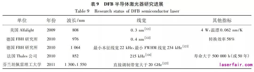 最早由貝爾實驗室的 H. Kogelikn等于 1972 年提出并在 1975 年實現(xiàn)室溫連續(xù)工作,之后在光通信領域得到了重視并迅速發(fā)展,其研究進展如表9所示。DFB 激光器的特點是光柵分布在整個諧振腔中,光波在反饋的同時獲得增益和激射,依靠光柵的選頻原理來實現(xiàn)波長選擇。它的制作方法有兩種: 一種是在生長完一部分 p 型波導層時中斷,外延一層低折射率光柵層,然后將晶片移出生長反應室,采用光刻和刻蝕形成統(tǒng)一的光柵,然后重新外延生長反應室,在光柵上繼續(xù)生長,最終形成 DFB 激光器,這種方法需要二次外延生長,對工藝要求比較高; 另一種方法是外延生長全部結束后,通過刻蝕形成表面光柵,不需要二次外延技術。