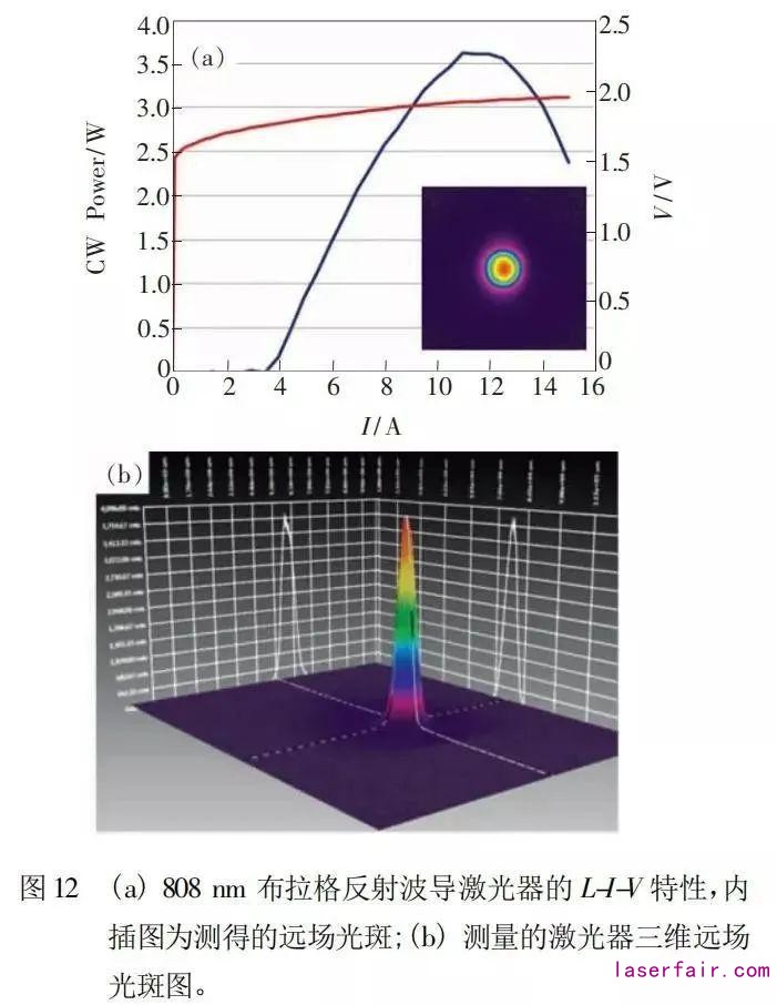 我們開展了 808 nm 波長布拉格反射波導光子晶體激光器( 圖 11) 的研究。利用光子晶體調控光學模式,實現(xiàn)了近圓形光束出光,成功地將傳統(tǒng)半導體激光快軸( 垂直) 發(fā)散角從 40°壓縮到10°以下( 半高全寬) ,實現(xiàn)了穩(wěn)定的圓形光斑激光輸出,其中優(yōu)化的三量子阱激光器含 95% 功率的垂直發(fā)散角可低至 9.8°,為當前報道的最低值,如圖 12 所示。由于這種激光器垂直方向的模式尺寸增大,因此可有效抑制災變光損傷。在腔面未鈍化條件下,寬條激光器單管連續(xù)和脈沖輸出功率分別可超過 3.5 W 和 11 W,bar 條脈沖輸出功率 > 70 W,10 μm 條寬脊形器件壓測條件下的單模準連續(xù)功率也超過了 1.1 W。