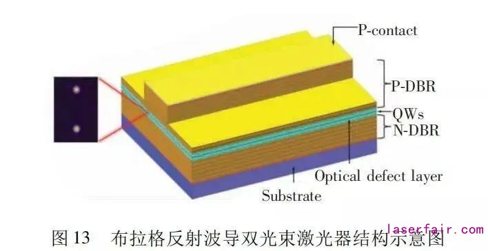 在半導體激光器的垂直方向引入布拉格反射波導結構,利用布拉格反射波導調控激光器工作在完全光子帶隙導引模式,可從芯片層次實現(xiàn)穩(wěn)定的對稱雙光束激光輸出,該方法結構簡單、價格低廉,易于批量生產。我們在國際上首次研制出布拉格反射波導雙光束激光器( 圖 13) ,激光器輸出兩束對稱的、近圓形的激光,單光束激光垂直發(fā)散角和水平發(fā)散角分別低至7.2°和5.4°。另外,這種激光器還具有明顯的光譜調制效應。
