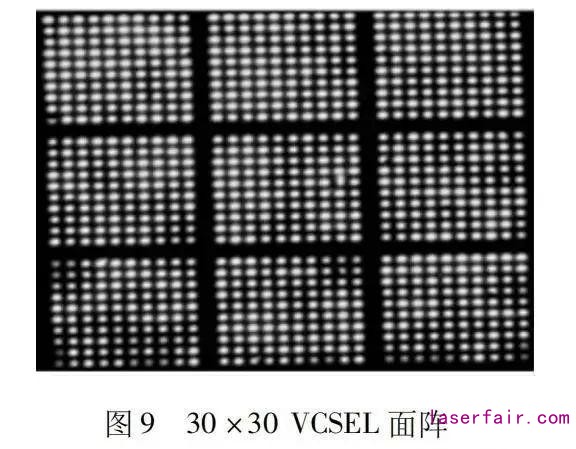2010 年,我們研制出 5 × 5、10 × 10、20 × 20的脈沖輸出 138,319,510 W( 60 ns × 100 Hz) 的 VCSEL 面陣。2011 年,我們發(fā)明了兩種偏振控制的 VCSEL 激光結構和激光器制備方法,研制出30 × 30 最高集成度( 64 個/mm^2 ) 的大功率 VC- SEL 面陣( 圖 9) ,在 3.75 nm × 3.75 mm 的面積共集成 900 個器件,單管器件連續(xù)輸出功率為 2.9 W,為發(fā)展兆瓦乃至更大功率激光光源開辟了新途徑。