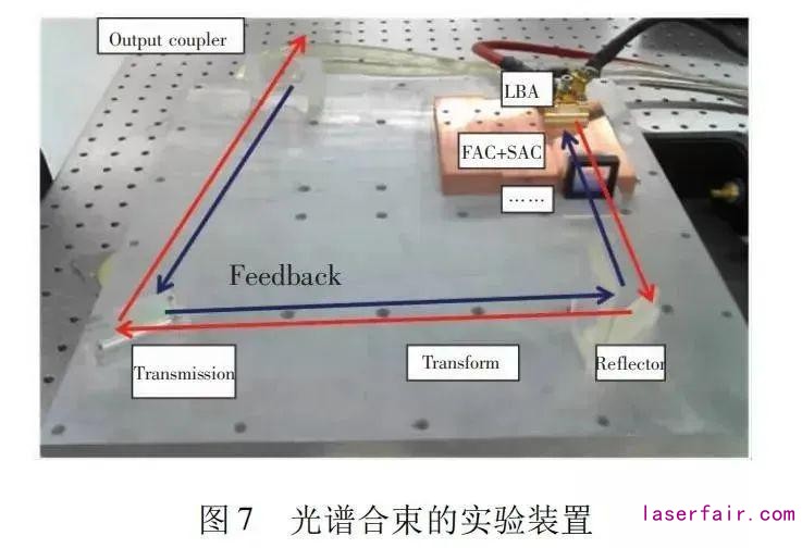 我們利用基于透射光柵的外腔 WBC 技術,先后研制出 808 nm、970 nm 的幾十瓦至數(shù)百瓦的光譜合束光源,光束質量僅為 3 ~ 5 mm·mrad,接近激光單元的光束質量。圖 7 為光譜合束的實驗裝置。