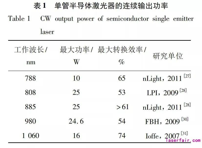 近幾年來,半導體激光器近紅外波段的輸出功率得到了顯著提高,目前單管激光器的連續(xù)輸出功率已超過 10 W,最高可達到 25 W,如表 1所示。