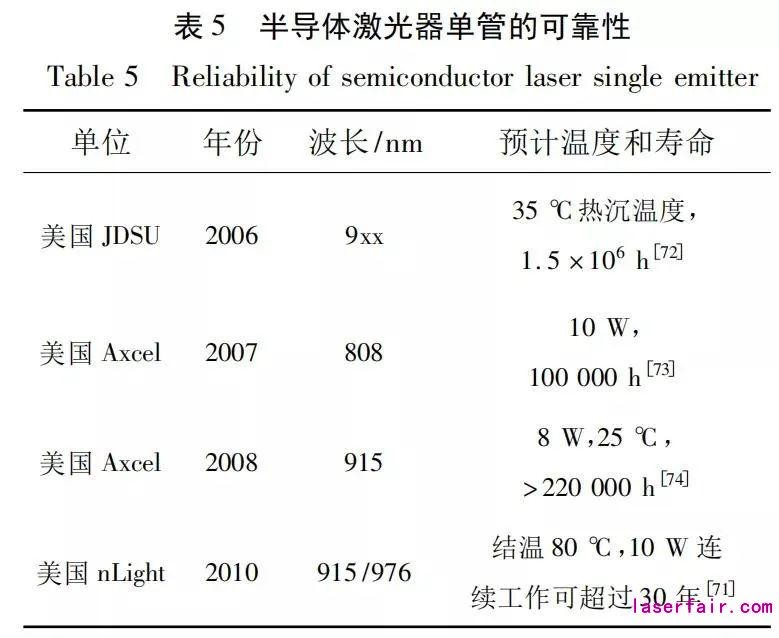 近年來,由于半導體激光器轉換效率的提升和封裝散熱工程的改進,半導體激光器單管報道的最長壽命很多已達到十萬小時以上,線陣的可靠性也有了非常明顯的提高。單管和 bar 條的研究進展如表 5 和表 6所示。