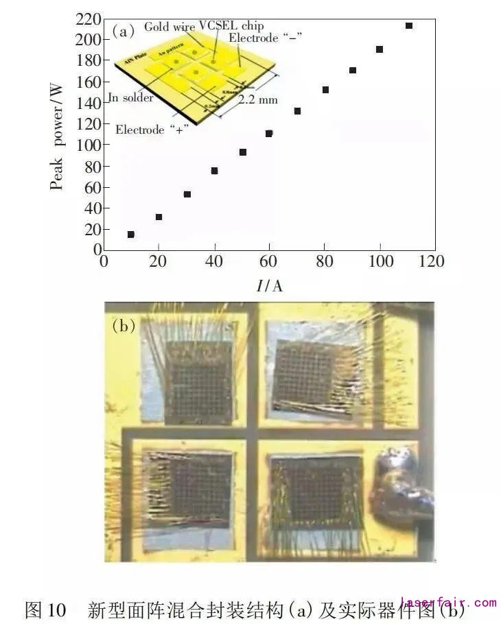 2014 年,我們針對大功率 VCSEL 面陣低電壓( 4 V,大電流 50 ~ 500 A) 驅動問題,發(fā)明了一種面陣混合封裝結構及其制備方法,如圖 10 所 示。利用 4 個高功率 VCSEL 單管串接,形成 980 nm 波段高功率準列陣模塊,尺寸為 2.2 mm × 2. mm,輸出功率高達 210 W。該突破使得微小型高功率 VCSEL 模塊有望在激光引信、激光測距及激光面陣雷達系統(tǒng)中實現(xiàn)實用化。