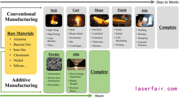 圖1 傳統(tǒng)制造工藝同3D打印多材料工藝的對比圖