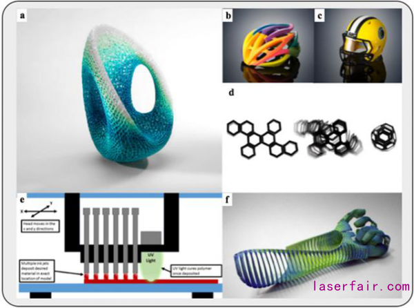 圖1為傳統(tǒng)制造工藝和3D打印工藝的對比,傳統(tǒng)制造工藝必須先單獨制造出部件來然后在通過后期的連接將其組合成一個整體。這一過程同傳統(tǒng)工藝制作巧克力是一樣的繁瑣復雜。對多材料打印來說,打印復合梯度材料或漸變材料可以在一個機器中完成。聚合物材料的3D打印系最早應用的多材料打印案例。主要是因為該材料打印時相對簡單而且相互間兼容性也比較好。多顏色的打印制品,如自行車頭盔、足球頭盔、防護手套等,均可以在滿足使用功能的前提下讓該物品變得更加多姿多彩,如圖2所示。同時打印出的多材料打印制品,可以隨環(huán)境變化而發(fā)生變化,這就是3D打印中的黑科技4D打印。盡管多材料3D打印的部件如此令人激動人心,他們大多用作概念原型來證明該多材料系統(tǒng)、功能的可行性。當然,也只有經歷了這一原型階段之后,多材料打印才會開始真正走進制作多材料金屬復合材料打印的發(fā)展時期。3D打印單一材料已經進入了實用階段。多材料打印中獨特的連接方式使得多材料打印同傳統(tǒng)制造工藝相比沒有焊縫存在,從而有效避免或減少了應力集中帶來的危害。同時多材料打印時使用的原材料基本是粉末,使得傳統(tǒng)工藝中兩者不易混合的工藝也變得十分容易。