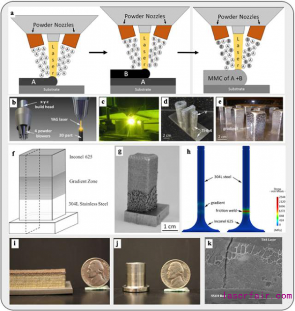 多材料打印時展現(xiàn)出來的獨特的魅力,不僅可以將兩種不同的材料實現(xiàn)100%的混合,同時實現(xiàn)設計結構件性能的均一性。這一理念導致了打印In718 和GRCoP-84復合材料,這是一種無磁性和有磁性的不銹鋼,Nb在Ti6Al4V中混合比例不同等,如圖3。多材料打印還可以通過添加不同的物相而改變金屬的性質,如二次金屬強化相。而且通過控制不同的添加量,還可以控制產品的性能。
