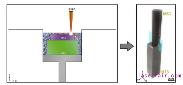 圖6 激光粉末床打印MS1(馬氏體不銹鋼)-H13(熱作模具鋼)多材料的示意圖