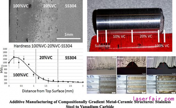 由于多材料打印可以一次成型且制造特定區(qū)域具有特殊性能的制品而成為非常有影響力和吸引力的技術。先進的金屬多材料打印可以通過金屬-金屬、金屬-陶瓷混合而實現(xiàn)特定區(qū)域的獨特性能。同傳統(tǒng)的局限于焊接結構相比,采用多材料打印就很容易實現(xiàn)功能、梯度材料的制備以提高其服役性能。金屬-陶瓷材料的多材料打印,如SiC在Ti6Al4V中。同理VC在不不銹鋼中,Ti6Al4V-Al2O3 中的功能梯度材料等。沉積100%的Al2O3 在Al2O3 基材中,然后逐漸過渡到打印不銹鋼,在過渡到打印Ti,已經被證明有多種用途。最終還有原位合成TiB-TiN增強的Ti6Al4V合金等。