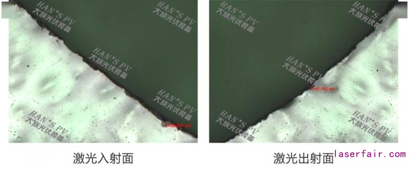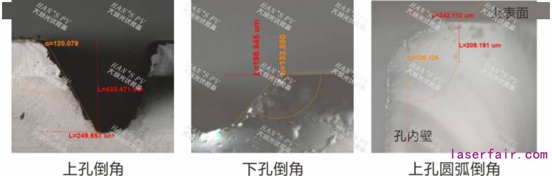上圖是以50X放大觀察最大崩邊。激光鉆孔未形成錐度孔、孔內(nèi)壁干凈、基本無(wú)粉塵殘留,其中激光出射面孔崩邊在50μm左右,激光入射面孔崩邊小于200μm。