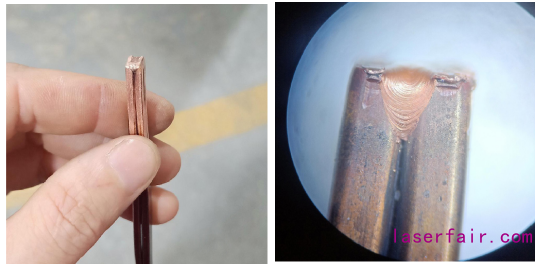 定子PIN屬于紫銅材質(zhì),而且熔深和剪切力要求高,采用高光束質(zhì)量連續(xù)光纖激光器焊接,可以保證在足夠小熔寬下,達到深的熔深,保證足夠的牢固性,確保電動機高速轉(zhuǎn)動中,定子PIN之間不斷開。從創(chuàng)鑫激光光纖激光器焊接電動機定子銅PIN的效果可見,其熔寬、熔深、剪切力和焊接表面外觀都符合新能源汽車的焊接要求。