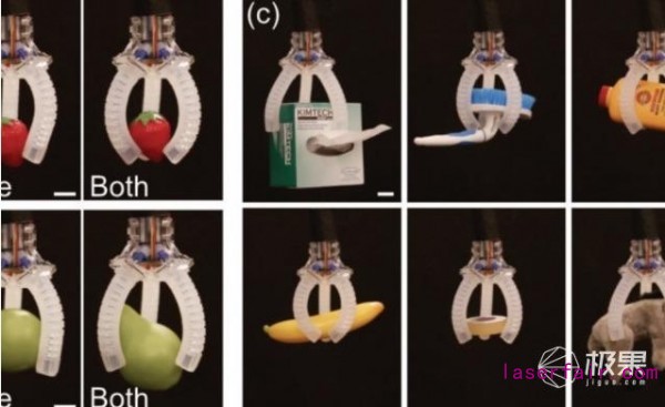 所以,研究小組選擇使用摩擦電傳感器。這種類型的組件提供了很高的可拉伸性和靈敏度,從而使機(jī)械手可以實(shí)時(shí)主動(dòng)感知和感知其變形或響應(yīng)。在該過程中3D打印起到了很大的作用,它不僅能夠使用多種材料,并利用縮短了原型制作時(shí)間的一步式打印過程。而研究人員的S-TECS傳感器是通過將摩擦電曲率傳感器和可伸縮電極相結(jié)合而構(gòu)造的,避免了與先前項(xiàng)目相同的集成復(fù)雜性。