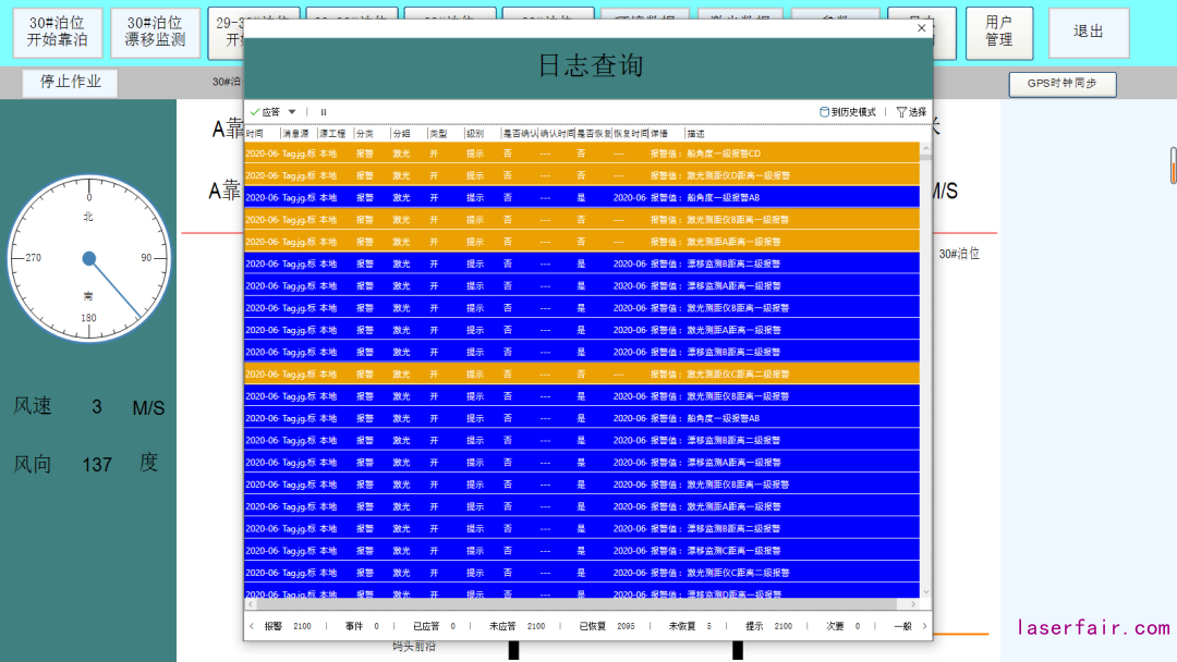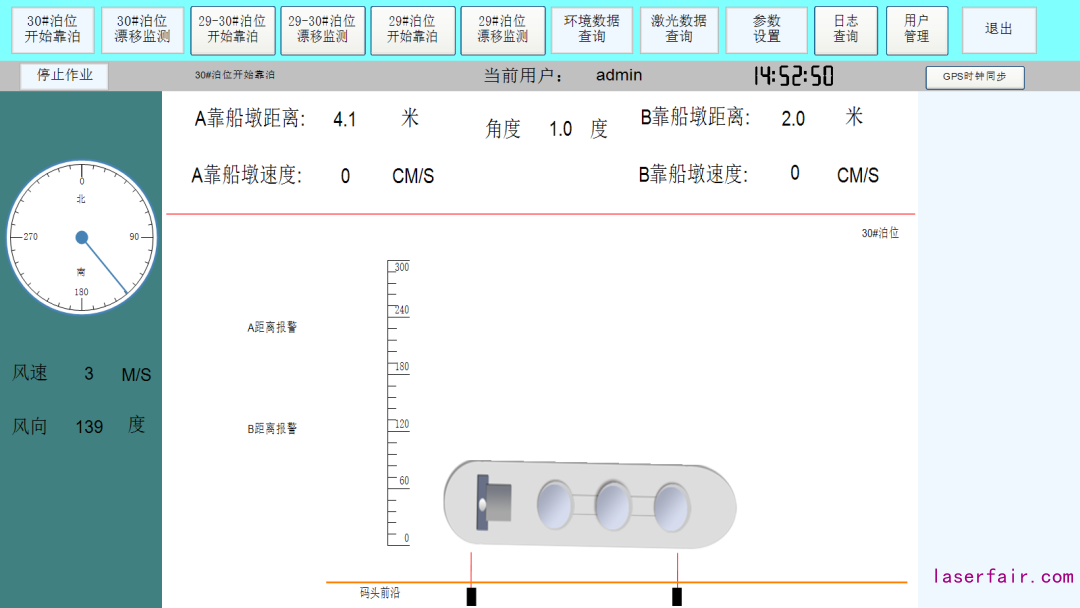 連云港新東方國(guó)際貨柜碼頭安裝的激光靠泊系統(tǒng)主要由激光測(cè)距儀、風(fēng)速儀、數(shù)據(jù)采集終端、在線監(jiān)控程序組成,由連云港中遠(yuǎn)海運(yùn)有限公司開發(fā)。系統(tǒng)前端利用安裝在碼頭前沿的兩個(gè)平行的激光測(cè)距儀,探測(cè)船舶上的兩點(diǎn)離岸距離,根據(jù)一定時(shí)間間隔的不同距離,折算出速度;根據(jù)兩點(diǎn)的距離計(jì)算出船舶與碼頭的角度,同時(shí)監(jiān)測(cè)風(fēng)速風(fēng)向,利用計(jì)算機(jī)算法算出船舶的靠泊速度,將船舶靠泊碼頭的全過(guò)程實(shí)時(shí)呈現(xiàn)在軟件平臺(tái),引航、海事、碼頭三方均可通過(guò)終端指導(dǎo)船舶靠泊作業(yè),防止船舶靠泊時(shí)因速度過(guò)快或角度過(guò)大而發(fā)生碼頭設(shè)施損壞及設(shè)備事故。