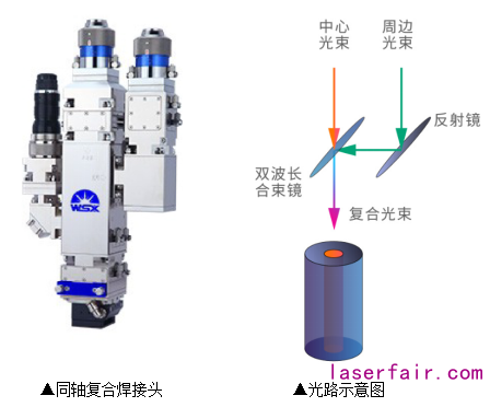 激光復(fù)合焊接一般指將兩不同狀態(tài)(空間位置、光束質(zhì)量、光斑形態(tài)、光束能量、光波長、作用時(shí)間等)的光束作用在焊接位置完成激光焊接;比較常用的是兩種波長不同的光束進(jìn)行同軸合成之后同時(shí)作用于焊接位置。