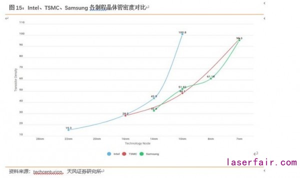 隨著這三個問題的解決,半導體制程向先進工藝發(fā)展。目前,臺積電和三星均已有 7nm 工藝,英特爾為 10nm 工藝,但從晶體管密度上看,英特爾 10nm 技術可與三星和臺積電的 7nm 技術媲美。