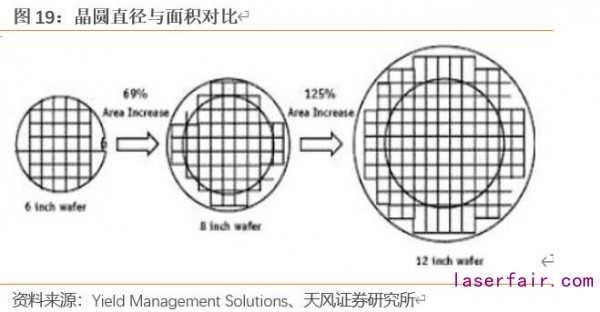 從晶圓發(fā)展歷程來看,晶圓尺寸經(jīng)歷了 2 英寸、4 英寸、5 英寸、6 英寸、8 英寸和 12 英寸。晶圓的尺寸越大,在單片晶圓上制造芯片的數(shù)量就越多,單片芯片的分攤成本隨之降低,并且晶圓片邊緣的損失會減小,因此發(fā)展大尺寸晶圓片有利于降低成本,但同時對設備和工藝的要求也越高。在同樣的工藝條件下,300mm 半導體晶圓的可使用面積超過200mm 晶圓的兩倍以上,可使用率(衡量單位晶圓可生產(chǎn)的芯片數(shù)量的指標)是 200mm 硅片的 2.5 倍左右。圖 19 為不同尺寸晶圓面積對比,資料來源于文章 Critical Dimension Sample Planning for 300 mm Wafer Fabs(作者:Sung Jin Lee, Raman K. Nurani, Ph.D., Viral Hazari, Mike Slessor, KLA-Tencor Corporation, J. George Shanthikumar, Ph.D., UC Berkeley)。