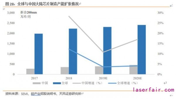 2017 至 2020 年,全球芯片制造產(chǎn)能(折合成 200mm)預計將從 1985 萬片/月增長至2407 萬片/月,年均復合增長率 6.64 ;中國芯片制造產(chǎn)能從 276 萬片/月增長至 460 萬片/月,年均復合增長率 18.50 。近年來,隨著中芯國際、華力微電子、長江存儲、華虹宏力等中國大陸芯片制造企業(yè)的持續(xù)擴產(chǎn),中國大陸芯片制造產(chǎn)能增速高于全球芯片產(chǎn)能增速。