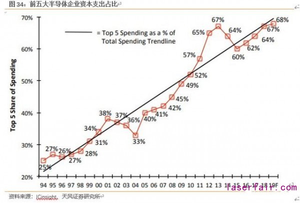 在資本支出方面,前五大公司(三星、英特爾、臺積電、SK Hynix 和美光)資本支出總額占全球半導體行業(yè)資本支出的 68%,創(chuàng)歷史新高。
