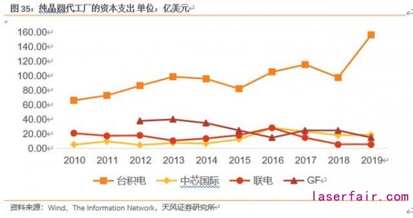 單看純晶圓代工廠,臺積電、中芯國際、聯(lián)電、格芯資本支出均在全球純晶圓代工廠前列。臺積電飛速上升,其中臺積電 19 年資本支出同比增長 61.6 %。中芯國際在這兩年略有下降,但相較 15 年前依舊處于較高水平。聯(lián)電在放棄 7nm 制程的研發(fā)后,資本支出近兩年有明顯下降。格芯雖然放棄了 7nm 制程,但是轉(zhuǎn)戰(zhàn) SOI 工藝,因此資本支出下降沒有聯(lián)電明顯
