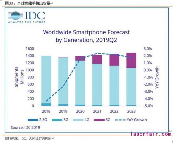 智能手機的成長動力主要源自 5G 的出現(xiàn)。2020 年是 5G 開始興起的一年,IDC 預計 2020 年將出貨 1.9 億部 5G 智能手機,占智能手機總出貨量的 14%,預計到 2023 年,這一數(shù)字將增長到全球智能手機出貨量的 28.1%。