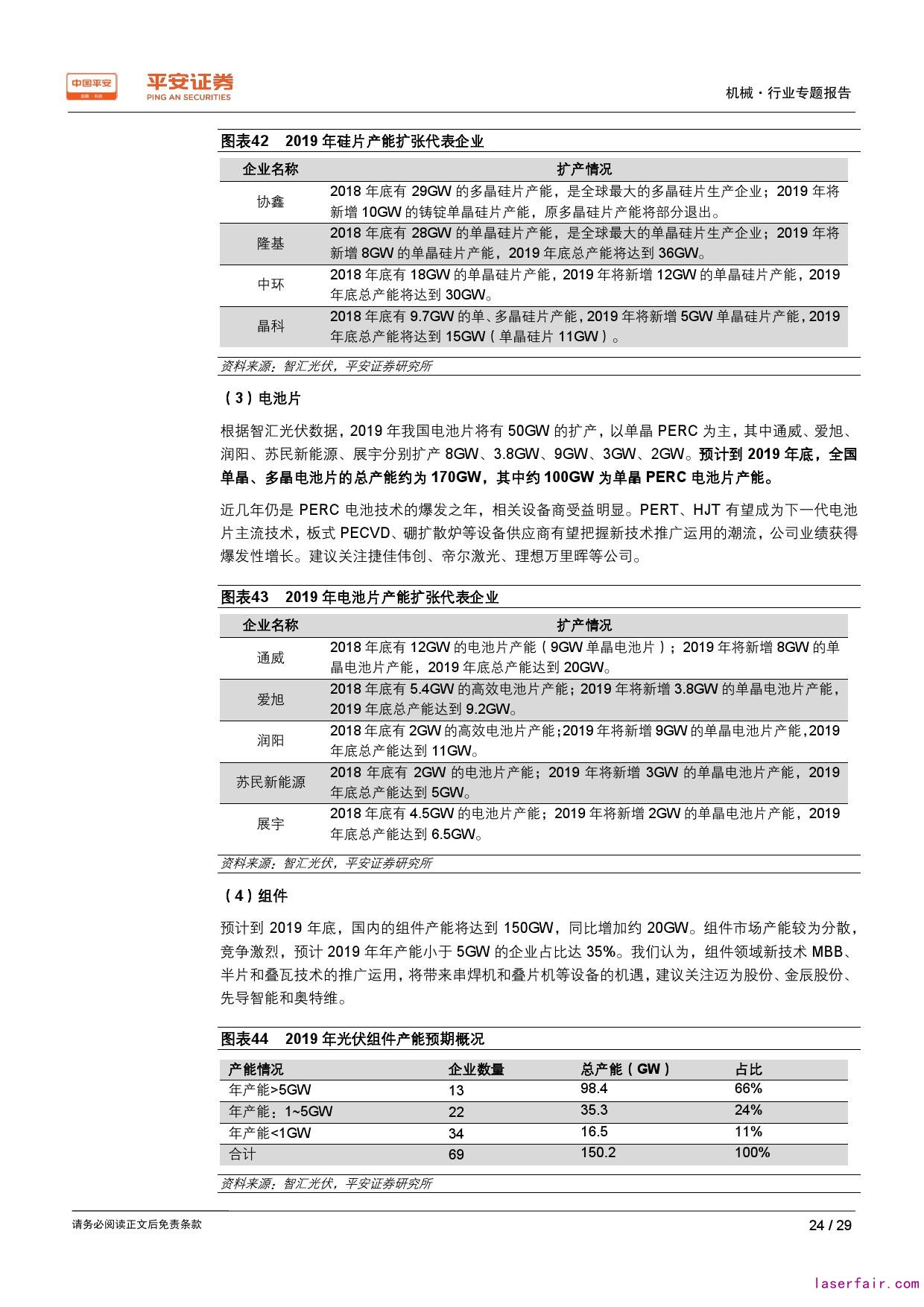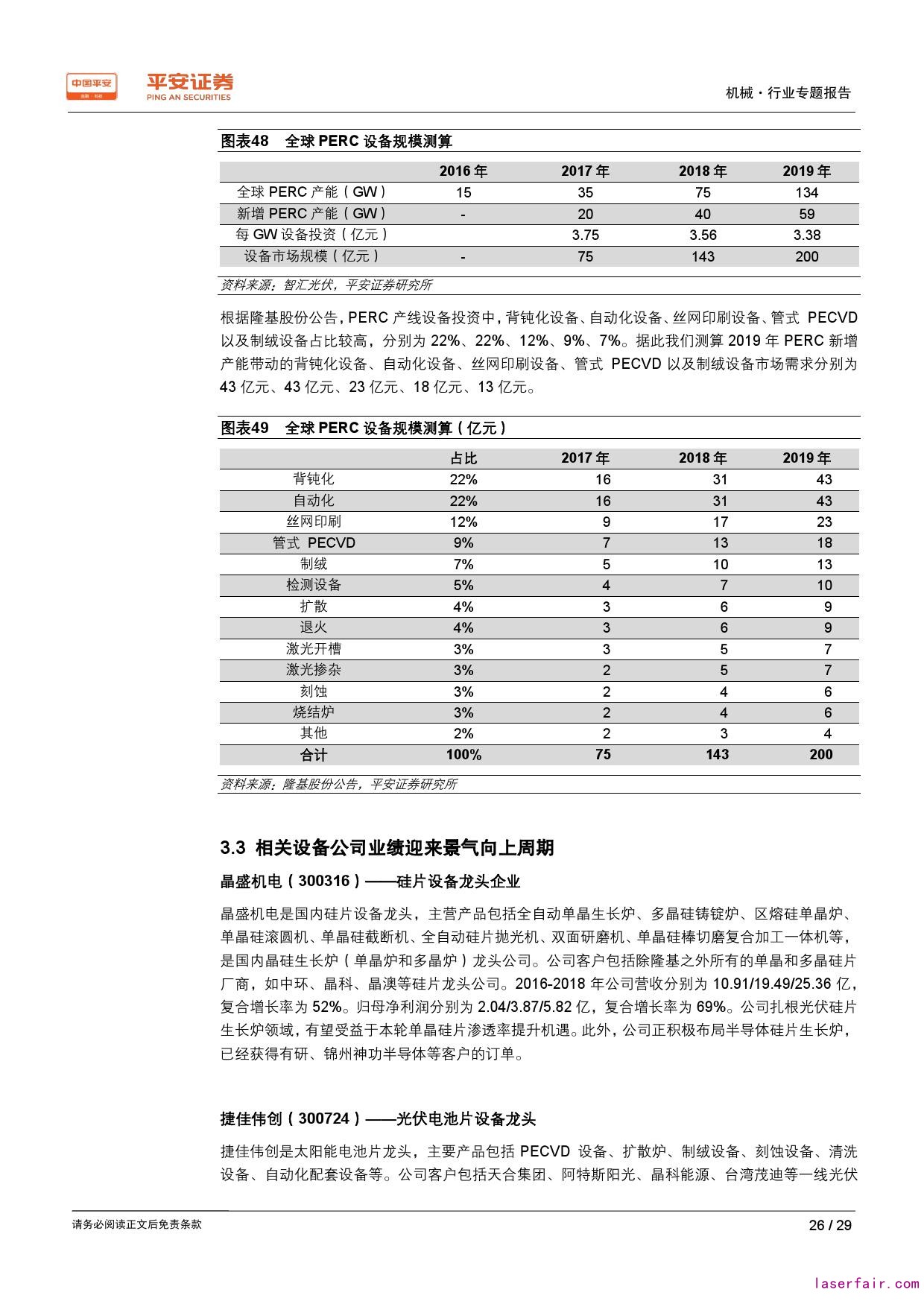 高效電池產(chǎn)能擴(kuò)張,設(shè)備公司機(jī)遇多。預(yù)計(jì)2019年我國(guó)硅料、硅片、電池片、組件分別擴(kuò)張產(chǎn)能約20萬噸、36GW、50GW、20GW,均以高效電池產(chǎn)能為主。2018年全球光伏設(shè)備市場(chǎng)總規(guī)模達(dá)48億美元,同比增長(zhǎng)7.62%。預(yù)計(jì)2019年全球PERC電池片設(shè)備市場(chǎng)規(guī)模達(dá)200億元,其中背鈍化設(shè)備、自動(dòng)化設(shè)備、絲網(wǎng)印刷設(shè)備占比最高,分別為43億元、43億元、23億元。我們認(rèn)為,未來幾年光伏設(shè)備市場(chǎng)將出現(xiàn)結(jié)構(gòu)性機(jī)會(huì),高效電池的設(shè)備商業(yè)績(jī)有望景氣向上。