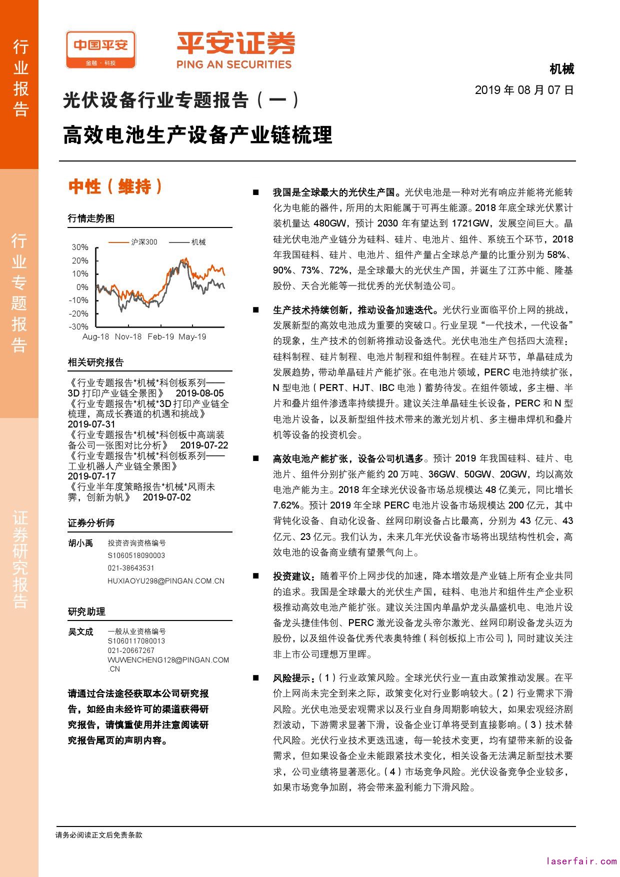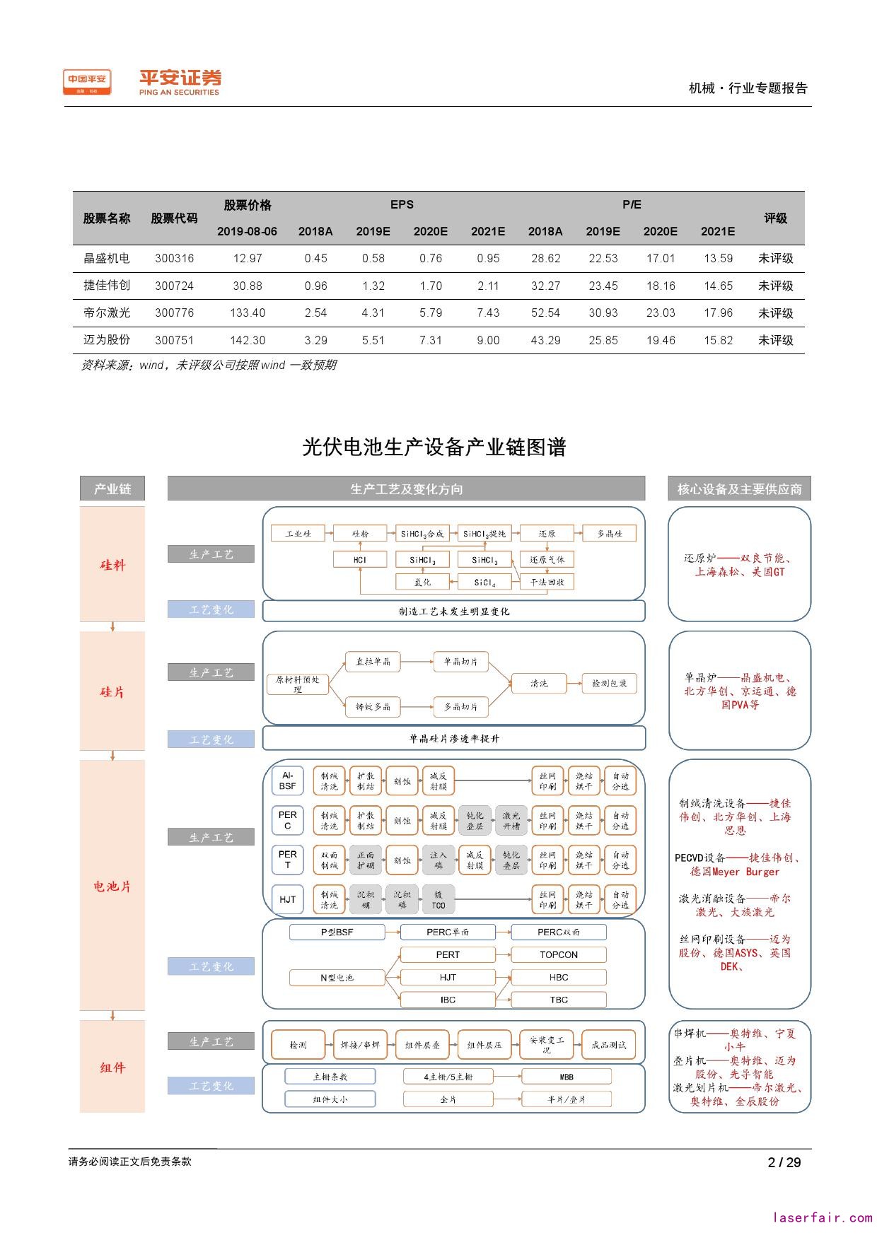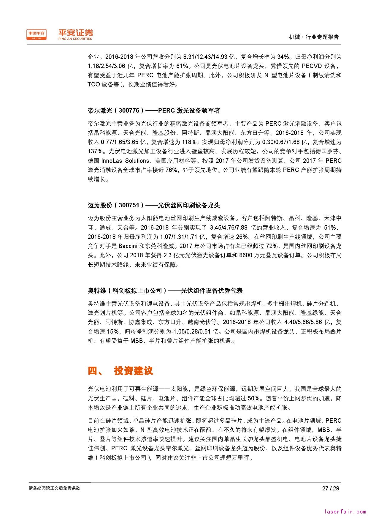 投資建議:隨著平價(jià)上網(wǎng)步伐的加速,降本增效是產(chǎn)業(yè)鏈上所有企業(yè)共同的追求。我國(guó)是全球最大的光伏生產(chǎn)國(guó),硅料、電池片和組件生產(chǎn)企業(yè)積極推動(dòng)高效電池產(chǎn)能擴(kuò)張。建議關(guān)注國(guó)內(nèi)單晶爐龍頭晶盛機(jī)電、電池片設(shè)備龍頭捷佳偉創(chuàng)、PERC激光設(shè)備龍頭帝爾激光、絲網(wǎng)印刷設(shè)備龍頭邁為股份,以及組件設(shè)備優(yōu)秀代表奧特維(科創(chuàng)板擬上市公司),同時(shí)建議關(guān)注非上市公司理想萬里暉。
