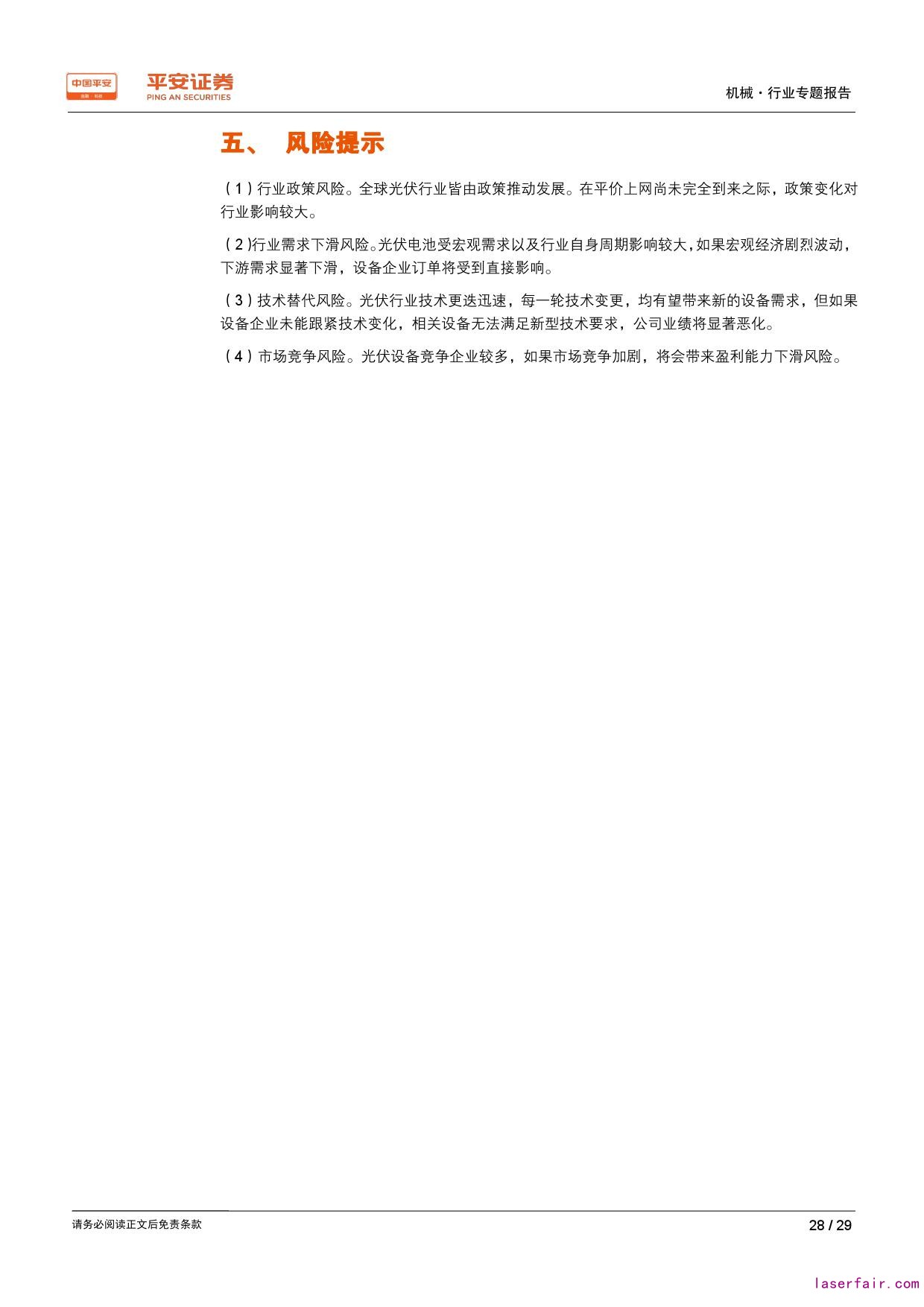 (2)行業(yè)需求下滑風(fēng)險(xiǎn)。光伏電池受宏觀需求以及行業(yè)自身周期影響較大,如果宏觀經(jīng)濟(jì)劇烈波動(dòng),下游需求顯著下滑,設(shè)備企業(yè)訂單將受到直接影響。