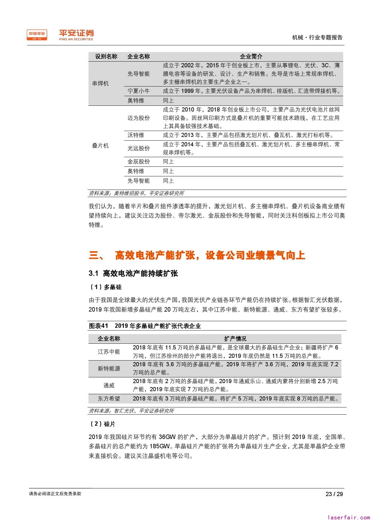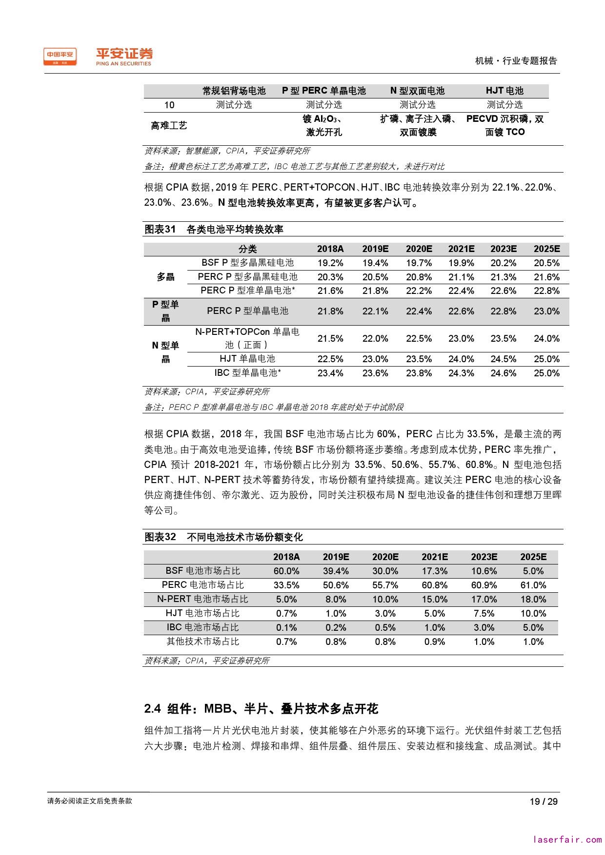 生產(chǎn)技術(shù)持續(xù)創(chuàng)新,推動(dòng)設(shè)備加速迭代。光伏行業(yè)面臨平價(jià)上網(wǎng)的挑戰(zhàn),發(fā)展新型的高效電池成為重要的突破口。行業(yè)呈現(xiàn)“一代技術(shù),一代設(shè)備”的現(xiàn)象,生產(chǎn)技術(shù)的創(chuàng)新將推動(dòng)設(shè)備迭代。光伏電池生產(chǎn)包括四大流程:硅料制程、硅片制程、電池片制程和組件制程。在硅片環(huán)節(jié),單晶硅成為發(fā)展趨勢(shì),帶動(dòng)單晶硅片產(chǎn)能擴(kuò)張。在電池片領(lǐng)域,PERC電池持續(xù)擴(kuò)張,N型電池(PERT、HJT、IBC電池)蓄勢(shì)待發(fā)。在組件領(lǐng)域,多主柵、半片和疊片組件滲透率持續(xù)提升。建議關(guān)注單晶硅生長(zhǎng)設(shè)備,PERC和N型電池片設(shè)備,以及新型組件技術(shù)帶來的激光劃片機(jī)、多主柵串焊機(jī)和疊片機(jī)等設(shè)備的投資機(jī)會(huì)。