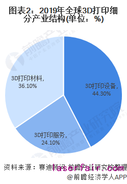 2019年,全球3D打印產(chǎn)業(yè)結構中,3D打印設備為核心產(chǎn)業(yè),其產(chǎn)業(yè)規(guī)模為52.97億美元,占比達到44.3%;其次為3D打印服務產(chǎn)業(yè)規(guī)模37.78億美元,占比達到31.6%;3D打印材料產(chǎn)業(yè)規(guī)模28.81億美元,占比24.1%。