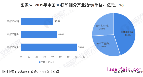 2019年,中國3D打印設備產(chǎn)業(yè)規(guī)模70.86億元,占比最高,達到45%;3D打印服務產(chǎn)業(yè)規(guī)模45.67億元,占比29%;3D打印材料產(chǎn)業(yè)規(guī)模40.94億元,占比26%。
