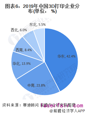 2019年,華東地區(qū)為中國3D打印企業(yè)主要聚集區(qū)域,占據(jù)全國42.4%。中南、華北、西南等地區(qū)也有優(yōu)秀企業(yè)集聚,分別占據(jù)23.8%、13.9%和8.4%的企業(yè)資源。華東地區(qū)的3D打印知名企業(yè)包括湖南華曙高科技有限責任公司、杭州先臨三維科技股份有限公司、上海光韻達三維科技有限公司、上海曼恒數(shù)字技術有限公司;中南地區(qū)的3D打印知名企業(yè)包括深圳市光華偉業(yè)實業(yè)有限公司、湖北嘉一三維高科股份有限公司等。