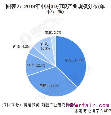 2019年,中南和華東地區(qū)由于3D打印設備與服務能力突出,產(chǎn)業(yè)規(guī)模分布位居全國第一、第二,分別占比37.2%和32.6%。華北地區(qū)則由于3D打印材料和服務能力突出,產(chǎn)業(yè)規(guī)模位居全國三位,占比12.4%。