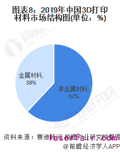 2019年,中國3D打印材料產(chǎn)業(yè)結構中,非金屬材料產(chǎn)業(yè)規(guī)模25.38億元,占比最高,達到62%;金屬材料產(chǎn)業(yè)規(guī)模15.56億元,占比38%。