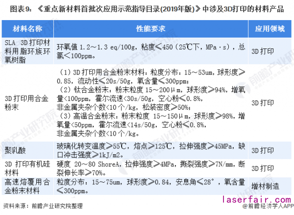2019年12月,工業(yè)和信息化部關于印發(fā)《重點新材料首批次應用示范指導目錄(2019年版)》,其中公布了6項與3D打印相關的重點新材料,分別為SLA 3D打印材料用脂環(huán)族環(huán)氧樹脂、3D打印用合金粉末、聚乳酸、3D打印有機硅材料和高速熔覆用合金粉末材料。