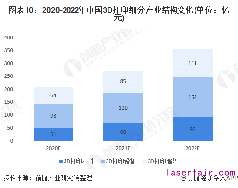 預計2020-2022年,3D打印設備依舊占據(jù)最大份額,占比逐年小幅下降,2022年,產(chǎn)業(yè)規(guī)模為154億元,占比達到43%。3D打印服務占比上漲,2022年,產(chǎn)業(yè)規(guī)模為111億元,占比為31%。3D打印材料未來三年占比保持穩(wěn)定,2022年,產(chǎn)業(yè)規(guī)模為92億元,占比26%。