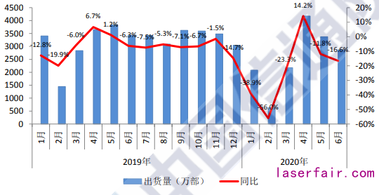 報(bào)告顯示,2020年6月,國(guó)內(nèi)手機(jī)市場(chǎng)總體出貨量為2863萬(wàn)部,同比下降16.6%。至此,今年上半年國(guó)內(nèi)手機(jī)市場(chǎng)總體出貨量累計(jì)達(dá)到1.53億部,同比下降17.7%。受新冠疫情影響,其中2月同比下降幅度最為明顯,達(dá)到56%。