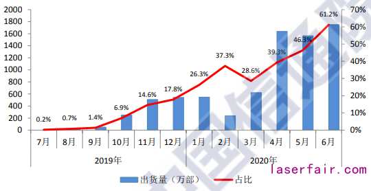 而在5G手機(jī)方面,2020年6月,國(guó)內(nèi)市場(chǎng)5G手機(jī)出貨量為1751.3萬(wàn)部,占同期手機(jī)出貨量的61.2%。上市新機(jī)型24款,占同期手機(jī)上市新機(jī)型數(shù)量的51.1%。上半年,國(guó)內(nèi)市場(chǎng)5G手機(jī)累計(jì)出貨量達(dá)到6359.7萬(wàn)部,上市新機(jī)型累計(jì)達(dá)到105款,占比分別為41.5%和48.6%。