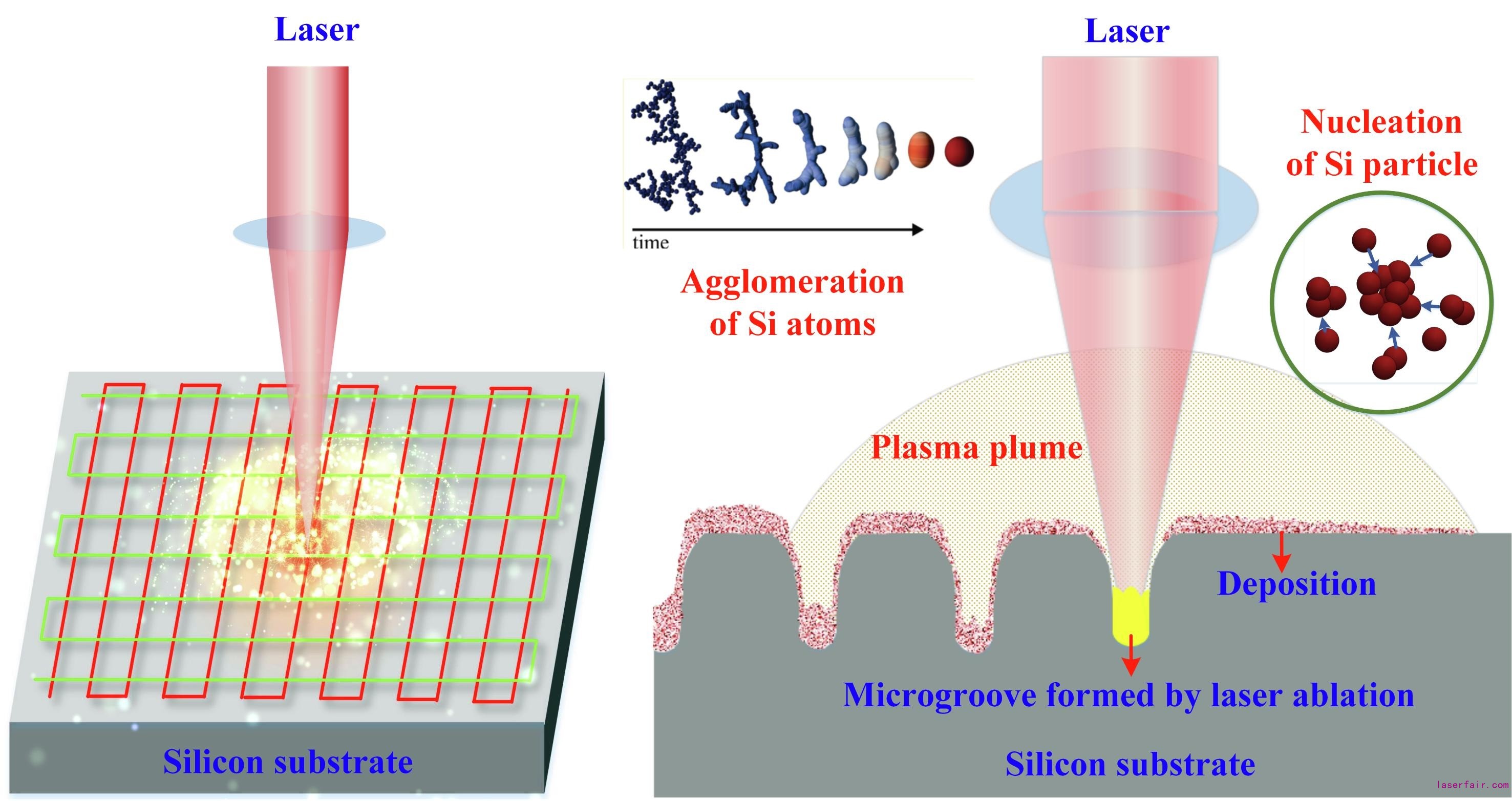 激光輻照用于微納結(jié)構(gòu)制備和在Si基材表面進(jìn)行沉積時的動力學(xué)示意圖