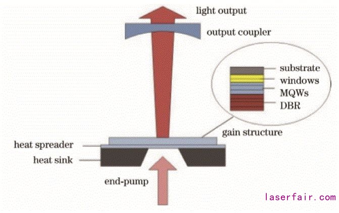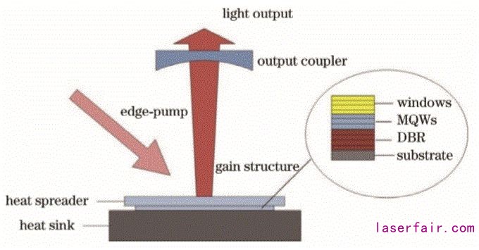 圖4為背端抽運的OP - VECSEL及其增益芯片的結構,與端面抽運不同,其抽運光從后腔鏡入射與輸出光同軸同向。盡管抽運光斑不大,但可獲得更加均勻的圓形抽運光斑,并且抽運光耦合系統相對容易架設,結構緊湊,更有利于激光的集成與封裝。其增益芯片為底發(fā)射結構,生長順序與頂發(fā)射不同,先在襯底上生長窗口層,再生長MQWs,最后生長DBR。再將DBR焊接到金剛石或SiC散熱片上。另外,由于抽運光通過DBR后才進入增益區(qū),因此要盡量使DBR對抽運光透明,對激光波長有高反射。