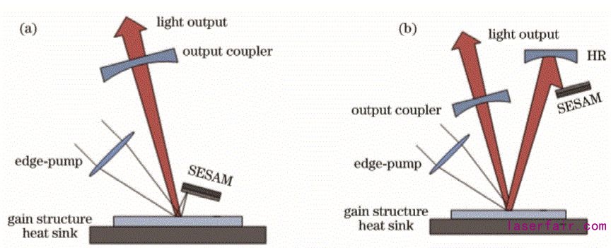 圖5 OP – VECSEL SESAM被動鎖模示意圖。(a)V型腔;(b)Z型腔