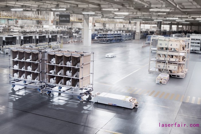 上汽大眾沖壓車間內(nèi)大規(guī)模應(yīng)用了重載AGV小車,完全取代了人工叉車搬運(yùn)料架零件,不僅提高了效率,還大幅提升了安全性和智能化。此外,沖壓車間還采用了德國舒勒6工序8100噸高速沖壓線,將料片沖壓成成品零件。該沖壓線共有6工序壓機(jī),總噸位達(dá)到8100噸,最大沖次能力達(dá)到15次/分鐘。