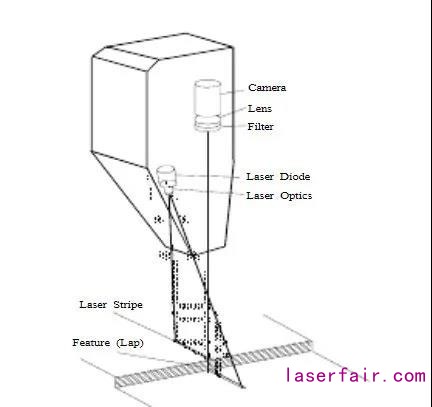 焊接跟蹤傳感器頭部包括一個(gè)CCD攝像機(jī)和一個(gè)或兩個(gè)半導(dǎo)體激光器。激光器作為結(jié)構(gòu)光源,以預(yù)定的角度將激光條紋投影到傳感器下部的工件表面。攝像機(jī)直接觀察在傳感器下部的條紋。攝像機(jī)前部是一個(gè)光學(xué)濾光片,允許激光通過但是濾去所有其他的光,例如焊接電弧。傳感器因此能夠非常接近焊接電弧。