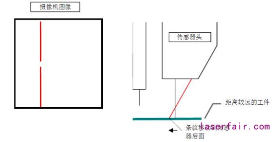 由于激光條紋是以一定的角度投影的,如果工件同傳感器距離太近,激光條紋的位置就相對(duì)靠前。反過來,如果工件同傳感器距離遠(yuǎn)一些,工件表面激光條紋的位置相對(duì)靠后。攝像機(jī)觀察激光條紋的位置,傳感器能夠測(cè)量距離工件的垂直距離。從條紋的形狀上看,傳感器也能夠測(cè)量表面的輪廓和焊縫在條紋上的位置,這就允許傳感器測(cè)量焊縫的橫向位置。