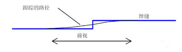 從攝像機(jī)觀察到的圖像被控制器處理,圖像首先被獲取并形成數(shù)字化的激光條紋圖像。然后軟件使用特定的設(shè)置來將條紋分成形成焊縫的許多條線。從這些線的位置,系統(tǒng)可以測(cè)量焊縫的位置,并將其轉(zhuǎn)化成以mm計(jì)算的距離。這種轉(zhuǎn)化是使用在傳感頭中存儲(chǔ)的校準(zhǔn)數(shù)據(jù)完成的。當(dāng)系統(tǒng)正在進(jìn)行跟蹤時(shí),焊接速度和前視距離被用來計(jì)算延遲時(shí)間。這就保證焊槍而不是傳感器沿著焊縫行進(jìn)。應(yīng)該指出的是控制策略提供了平滑的前視距離以保證形成平滑的焊縫。因此如果傳感器在路徑上遇到了一個(gè)臺(tái)階的變化,他將會(huì)提供一個(gè)平滑的響應(yīng),如下圖所示。